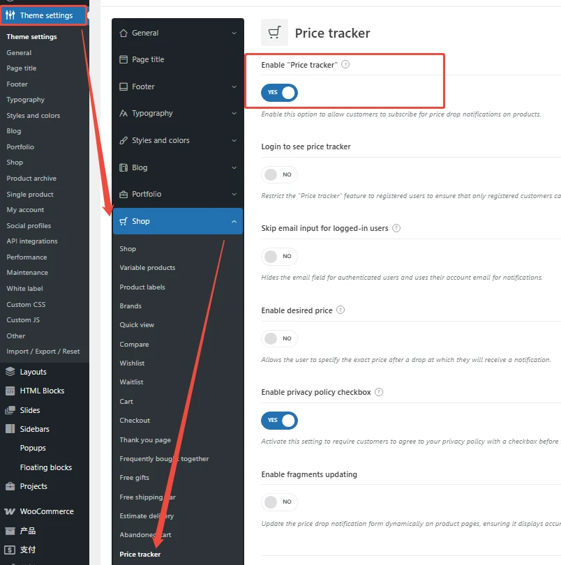 在WordPress后台 – Theme setting – Shop – Price tracker 里开启价格追踪功能。
