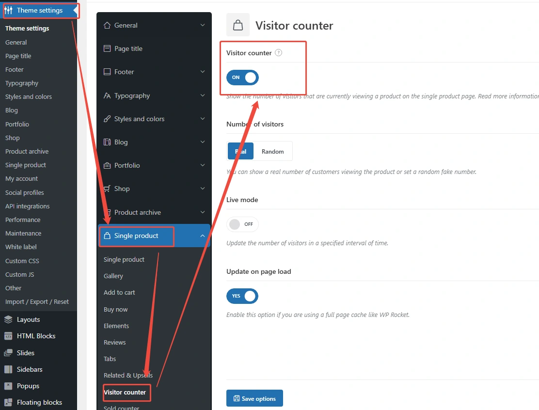开启路径:WordPress后台 – Theme Settings – Single Product – Visitor counter。
