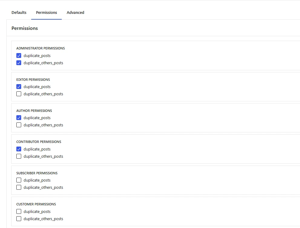 就是控制網站不同的使用者角色是否開啟複製文章的功能,以及是否能複製其他後台使用者的文章。
