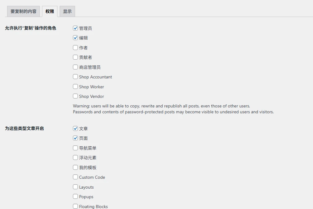 可以選擇為哪些角色開啟複製功能、為哪些類型的文章開啟複製功能。