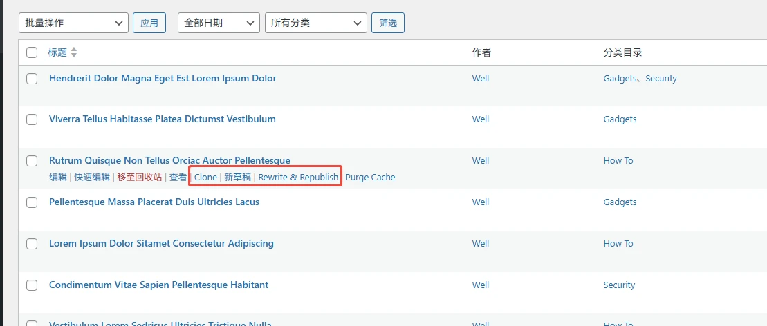 外掛啟用後就能在文章列表裡看到新增的三個按鈕:Clone、新草稿、Rewrite & Republish ↓