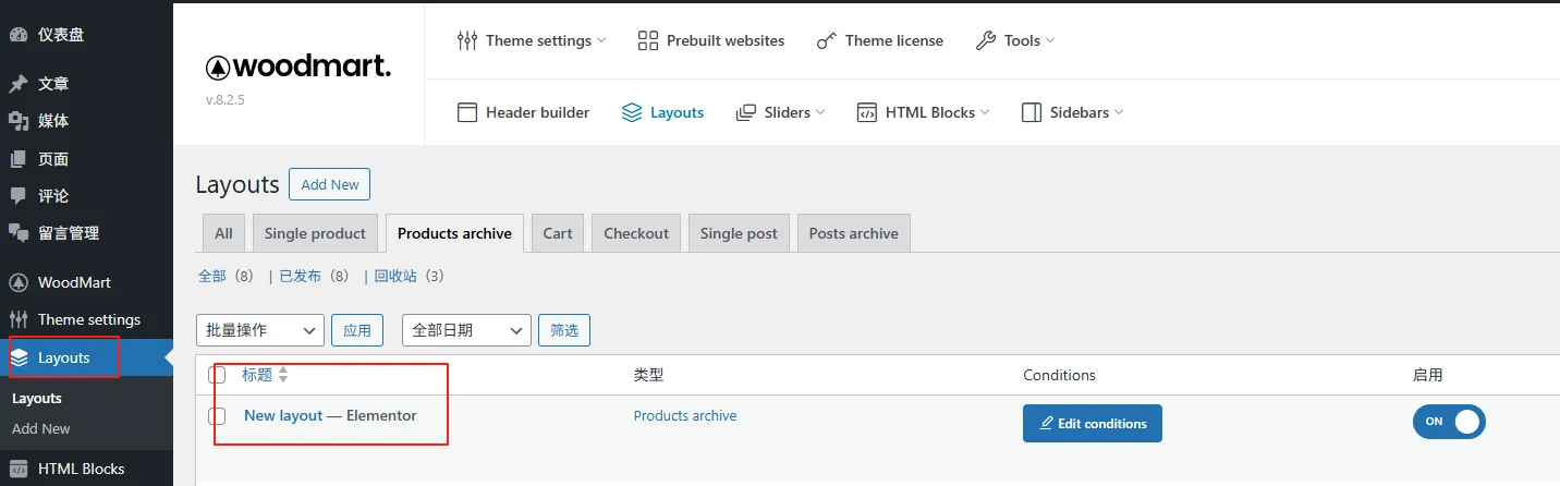先在Layouts 找到你網站的產品聚合頁模板,使用Elementor 編輯它↓